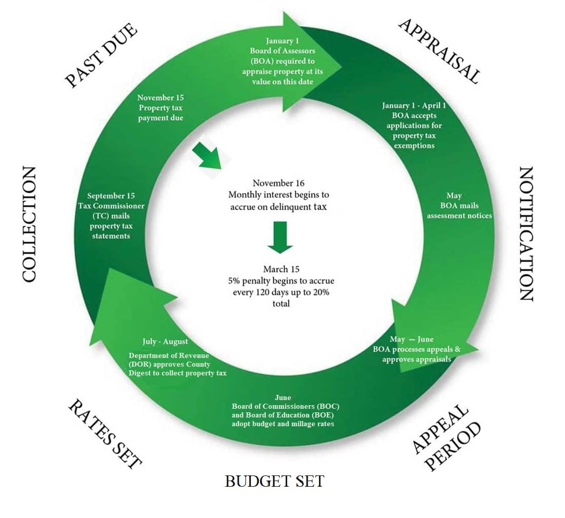 Tax Commissioner (TC) – The Tax Commissioner is responsible for the annual billing of property tax by using the property values set by the BOA and millage rates set by the BOC and BOE to arrive at the amount of tax due. We bill and collect the tax dollars and then distribute those taxes to the state, county and schools. We do not determine which property is to be taxed nor the values or classification of property.